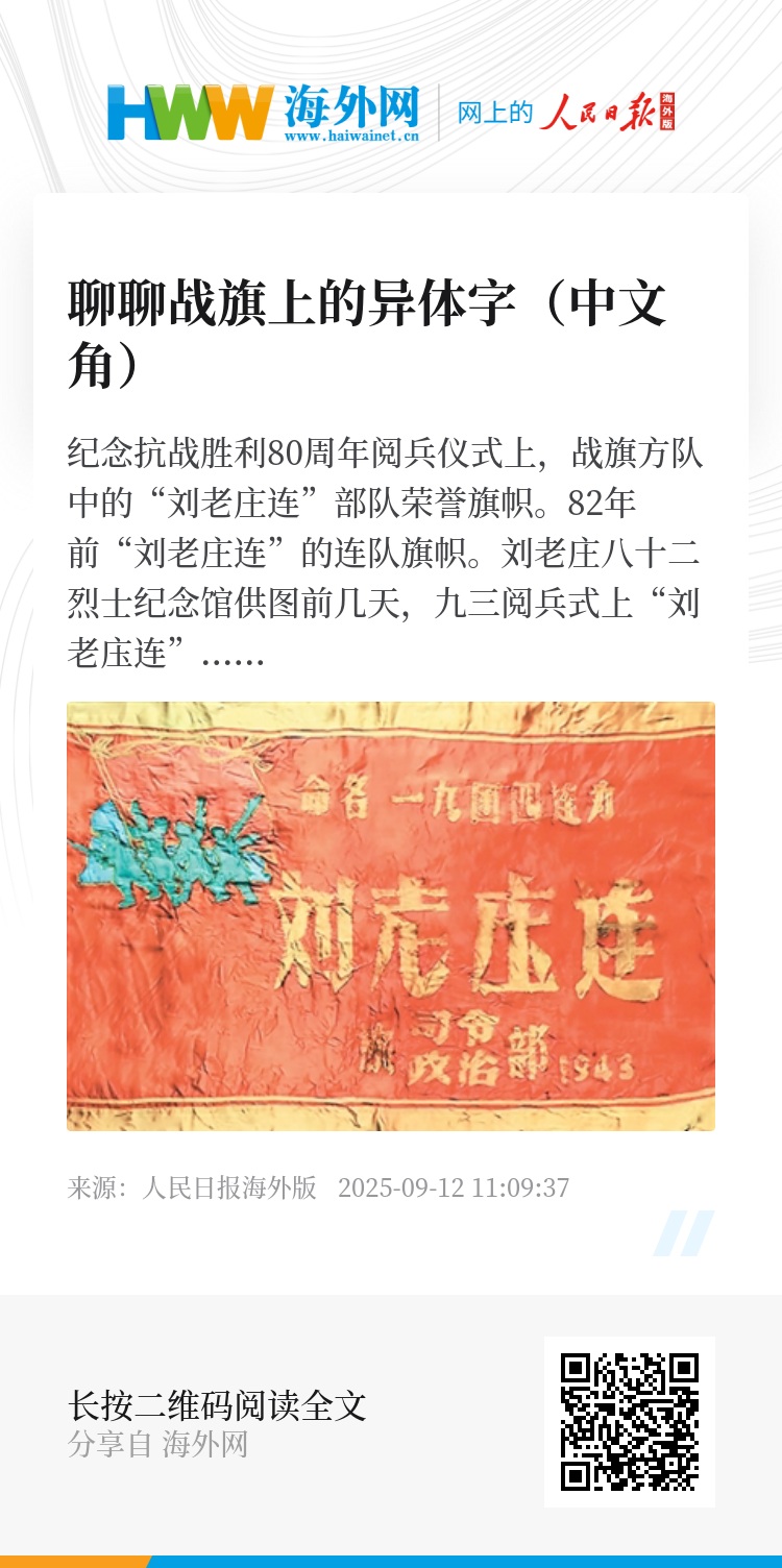 对待异体字,既应承认其历史意义,又要遵循现代汉字规范。就像战旗上的“庒”字,是82年前的历史印记,是为了“让英雄找得到部队”;而今我们书写“庄”字,是为了让更多人顺畅理解这些故事。如此,方能让汉字在现代社会持续发挥其文化与实用价值。(陈静文)