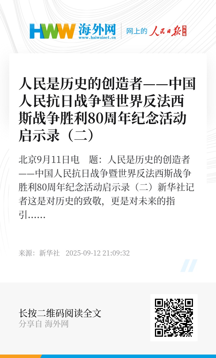 新华社北京9月11日电 题:人民是历史的创造者——中国人民抗日战争暨世界反法西斯战争胜利80周年纪念活动启示录(二)
