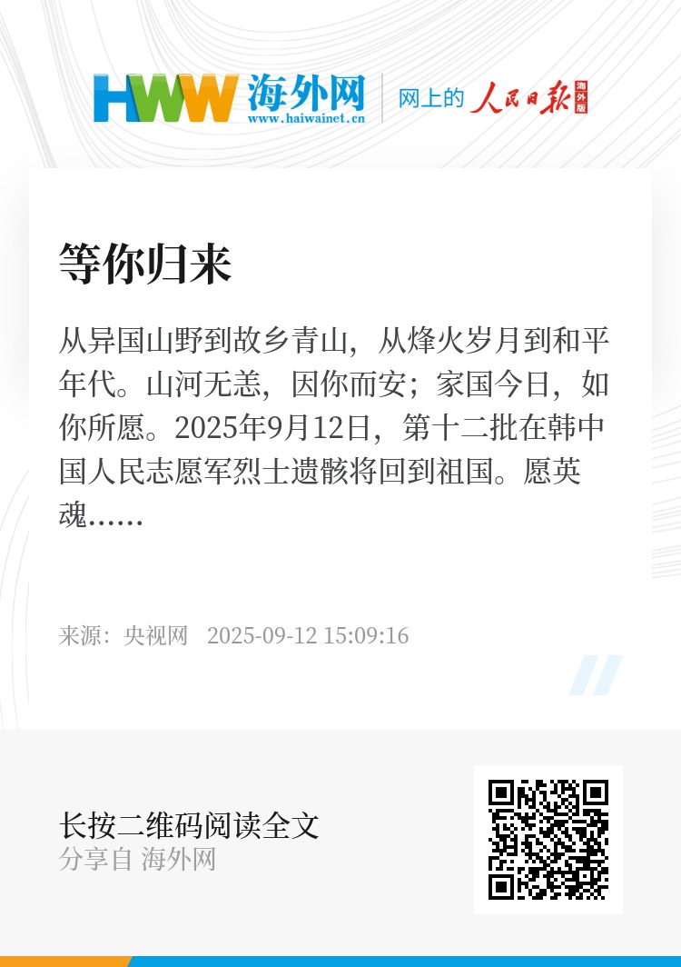 从异国山野到故乡青山,从烽火岁月到和平年代。山河无恙,因你而安;家国今日,如你所愿。2025年9月12日,第十二批在韩中国人民志愿军烈士遗骸将回到祖国。愿英魂得安息,愿忠骨映山河。