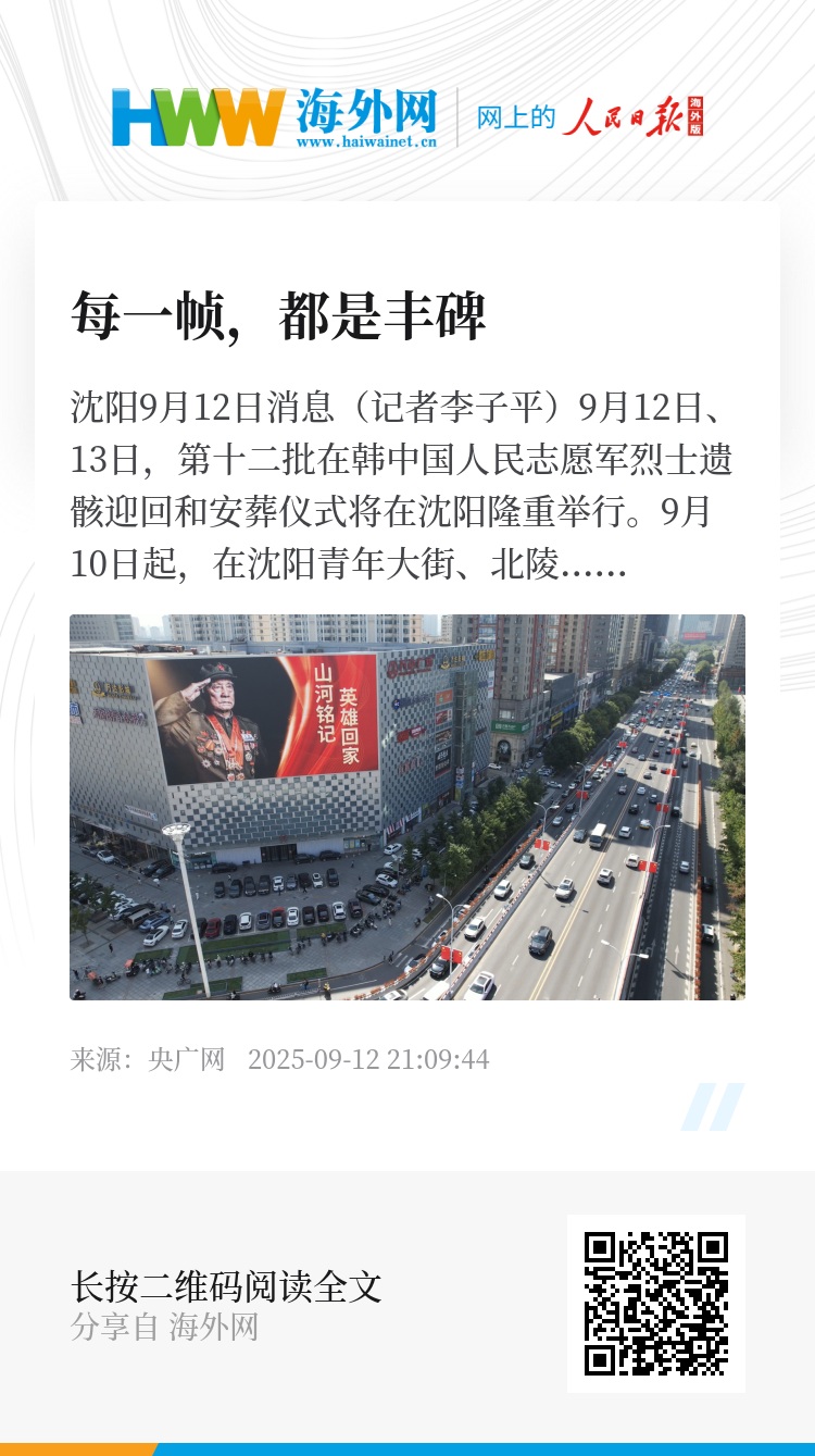 央广网沈阳9月12日消息(记者李子平)9月12日、13日,第十二批在韩中国人民志愿军烈士遗骸迎回和安葬仪式将在沈阳隆重举行。9月10日起,在沈阳青年大街、北陵大街沿线,人们都会在户外电子屏上看到一张震撼人心的照片——一名敬礼的志愿军老战士,目光坚毅,在期待战友归来。这张照片的作者,是退役军人、辽宁省雷锋研究会理事姚振锋。