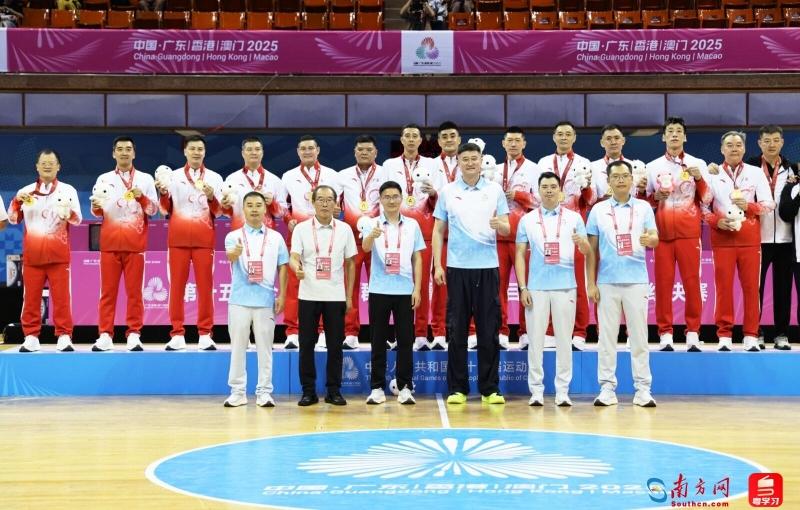 中国男篮前主教练杜锋(前排右三)作为颁奖嘉宾为十五运会群众比赛五人篮球男子C组冠军广东队颁奖并合影。