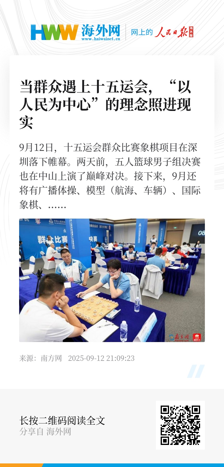 9月12日,十五运会群众比赛象棋项目在深圳落下帷幕。两天前,五人篮球男子组决赛也在中山上演了巅峰对决。接下来,9月还将有广播体操、模型(航海、车辆)、国际象棋、太极拳等多个群众比赛项目陆续开展。