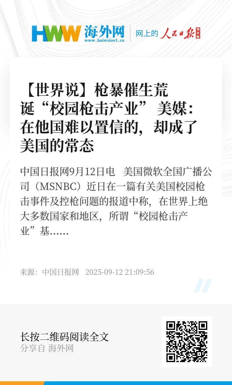 中国日报网9月12日电 美国微软全国广播公司(MSNBC)近日在一篇有关美国校园枪击事件及控枪问题的报道中称,在世界上绝大多数国家和地区,所谓“校园枪击产业”基本上是一个难以想象的概念,但它在美国却成为了现实中确实存在的常态。