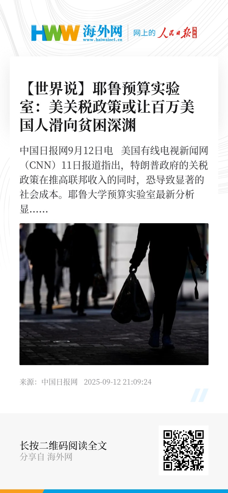 中国日报网9月12日电 美国有线电视新闻网(CNN)11日报道指出,特朗普政府的关税政策在推高联邦收入的同时,恐导致显著的社会成本。耶鲁大学预算实验室最新分析显示,这一系列政策或使近百万美国人陷入贫困。