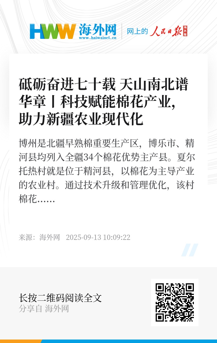博州是北疆早熟棉重要生产区,博乐市、精河县均列入全疆34个棉花优势主产县。夏尔托热村就是位于精河县,以棉花为主导产业的农业村。通过技术升级和管理优化,该村棉花亩产从200公斤跃升至400公斤以上,2025年预计全村棉花总产值超2000万元。(季星兆 何思琦)