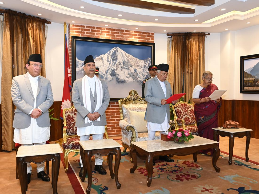 9月12日晚,在尼泊尔首都加德满都的总统府,尼泊尔总统鲍德尔(右二)主持仪式,尼泊尔最高法院前首席大法官苏希拉·卡尔基(右一)宣誓就任尼临时政府总理。新华社发(尼泊尔总统府供图)