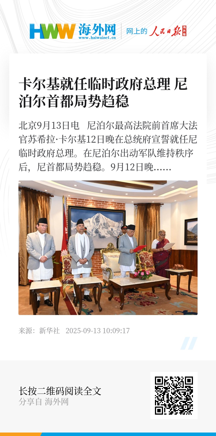新华社北京9月13日电 尼泊尔最高法院前首席大法官苏希拉·卡尔基12日晚在总统府宣誓就任尼临时政府总理。在尼泊尔出动军队维持秩序后,尼首都局势趋稳。