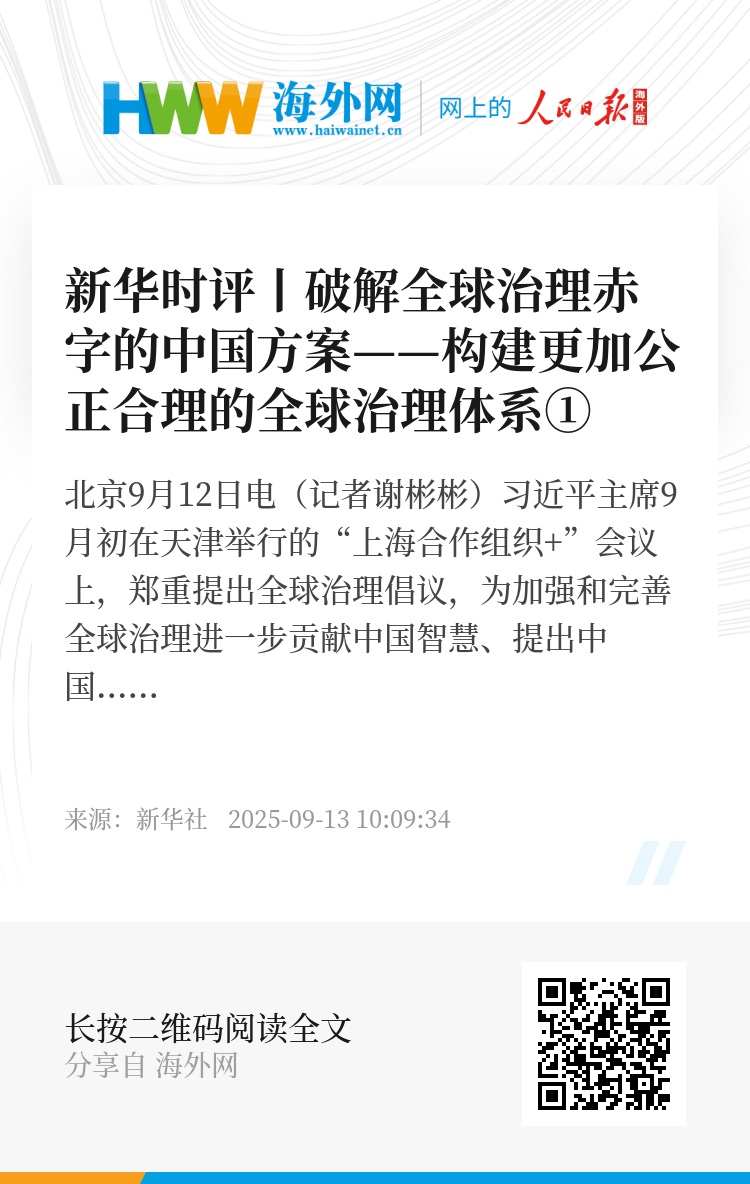 新华社北京9月12日电(记者谢彬彬)习近平主席9月初在天津举行的“上海合作组织+”会议上,郑重提出全球治理倡议,为加强和完善全球治理进一步贡献中国智慧、提出中国方案。这一倡议聚焦“构建什么样的全球治理体系,如何改革完善全球治理”这个时代课题,以维护联合国宪章宗旨和原则,践行共商共建共享的全球治理观为基本遵循,推动构建更加公正合理的全球治理体系,携手迈向人类命运共同体。