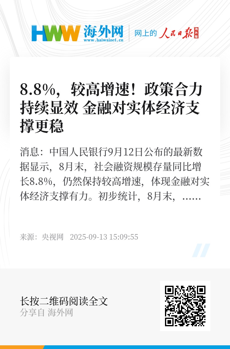 央视网消息:中国人民银行9月12日公布的最新数据显示,8月末,社会融资规模存量同比增长8.8%,仍然保持较高增速,体现金融对实体经济支撑有力。