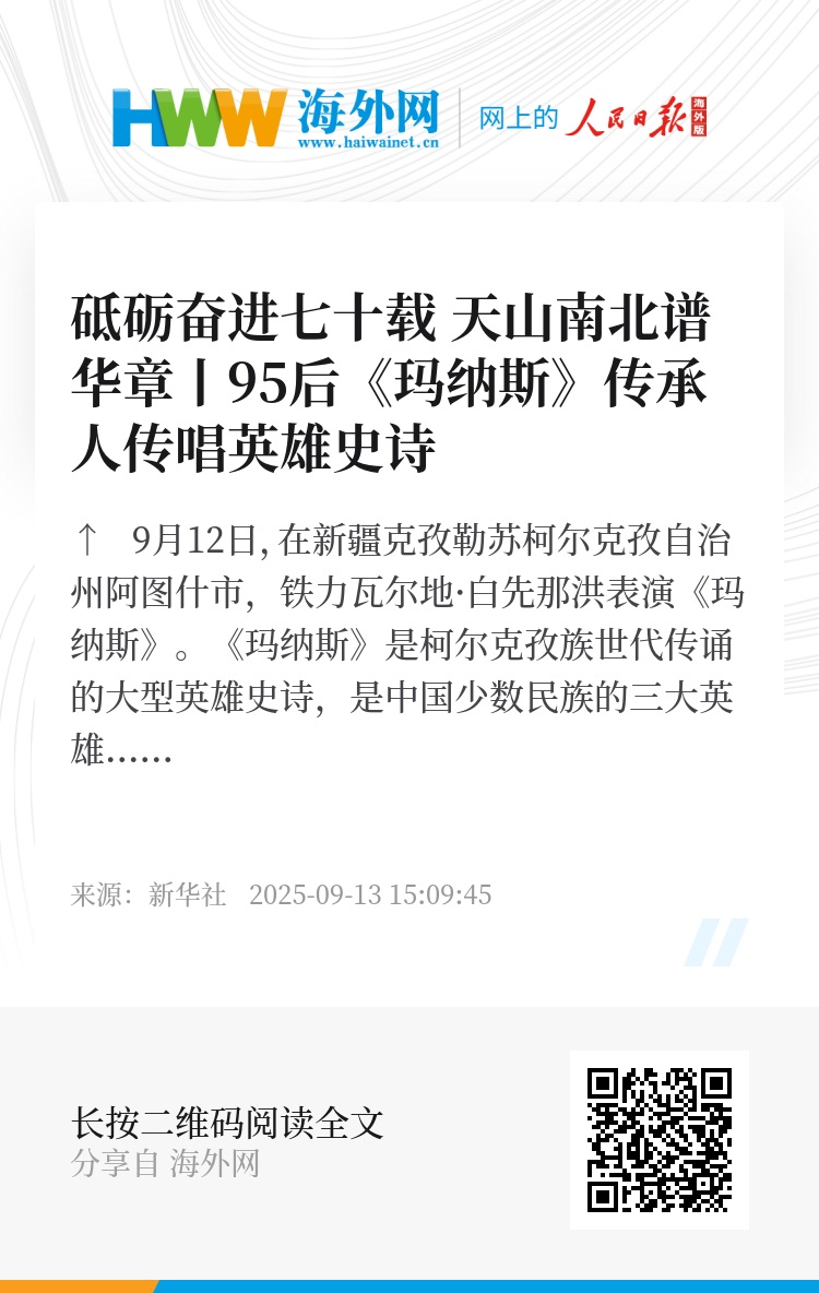 《玛纳斯》是柯尔克孜族世代传诵的大型英雄史诗,是中国少数民族的三大英雄史诗之一。2009年,《玛纳斯》被列入联合国教科文组织“人类非物质文化遗产代表作名录”。《玛纳斯》州级代表性传承人铁力瓦尔地·白先那洪是位95后,他从小学习表演《玛纳斯》,立志要将这一民族瑰宝继续传承下去。现如今,他已经有徒弟20多人。