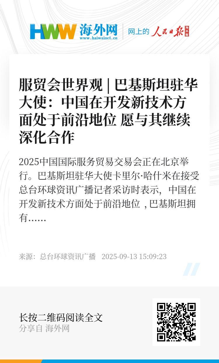 2025中国国际服务贸易交易会正在北京举行。巴基斯坦驻华大使卡里尔·哈什米在接受总台环球资讯广播记者采访时表示,中国在开发新技术方面处于前沿地位 ,巴基斯坦拥有年轻人才,希望两国在物流网、智慧城市、量子计算领域深度合作,共同发展。