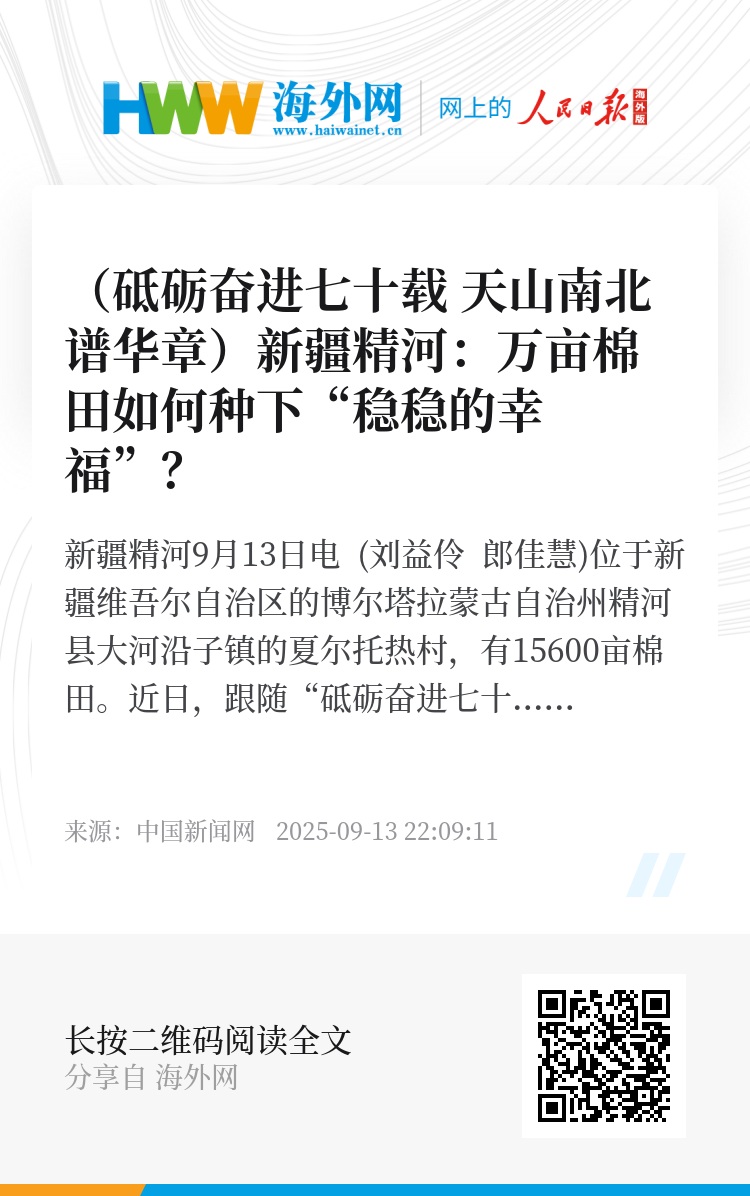 中新网新疆精河9月13日电 (刘益伶 郎佳慧)位于新疆维吾尔自治区的博尔塔拉蒙古自治州精河县大河沿子镇的夏尔托热村,有15600亩棉田。