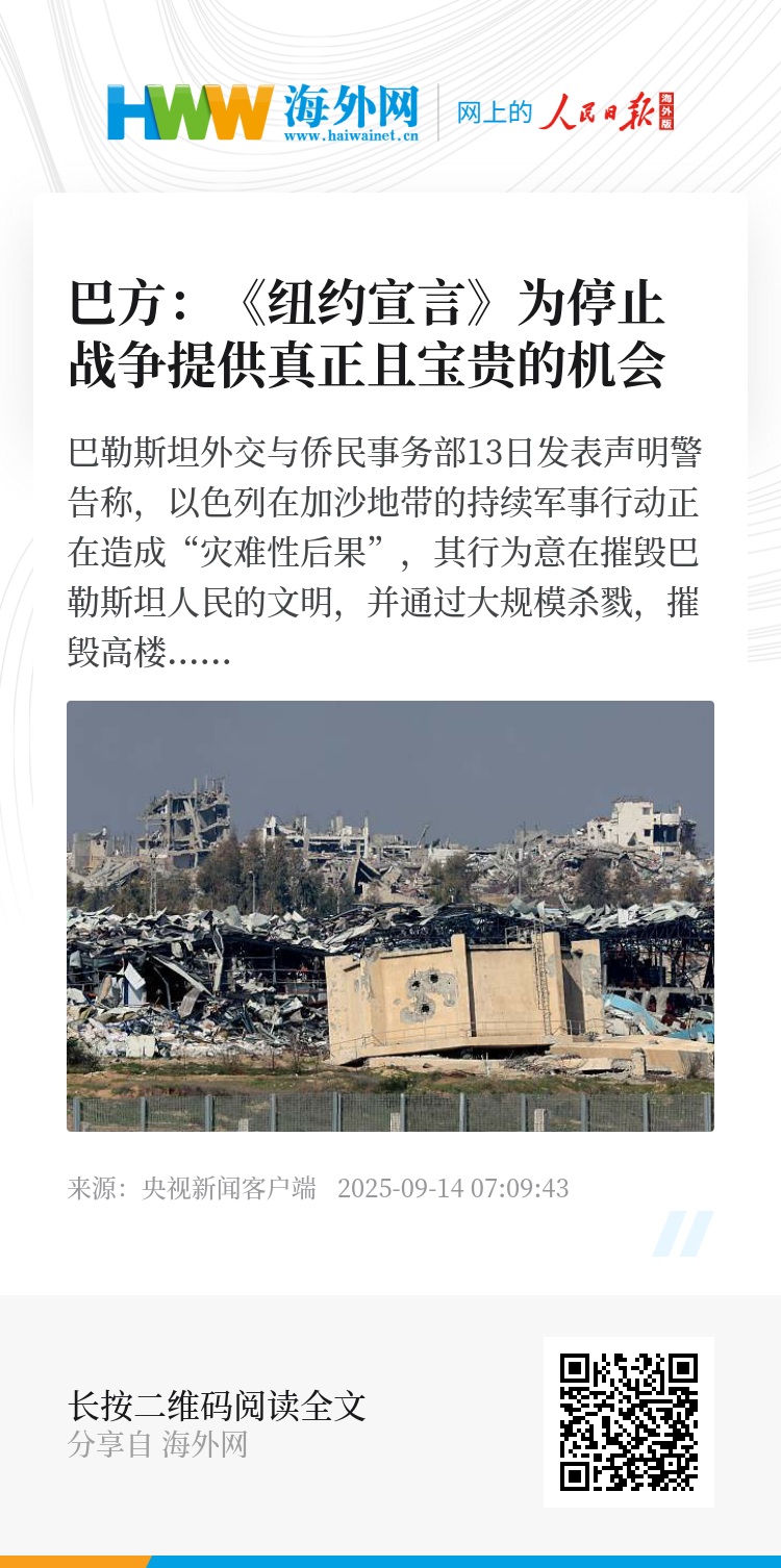 声明称,联合国大会通过的《纽约宣言》为停止战争、推动外交努力提供了“真正且宝贵的机会”,有助于停止战争与杀戮,实现真正和平。并呼吁国际社会应立即行动,利用这一机遇遏制暴力升级,结束加沙人道主义灾难,推动实现全面、持久和平。(总台记者 梁慧)