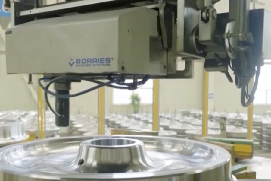 高温锻造之后的钢坯被压成一片冒着火光的钢饼,经过冷却后被送往下一个“车削”车间,这里的加工过程就好比我们做美甲,需要修型、打磨,这里的机械臂会进行精细加工,直到车轮尺寸和光滑度都完美符合图纸要求。
