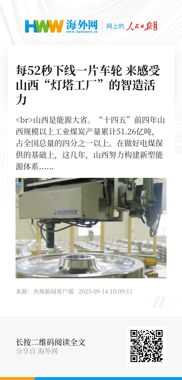 “十四五”期间,山西高端装备制造业增加值年均增长7.2%。就在去年,山西的一家车轮生产企业成功入选全球“灯塔工厂”网络,成为全球轨道交通行业首座“灯塔工厂”。“灯塔工厂”被誉为“世界上最先进的工厂”,是当今全球制造业领域智能化和数字化的高水平代表。