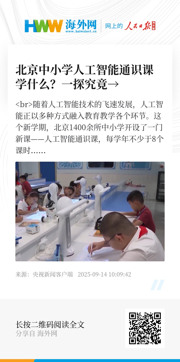 这个学期,北京1400多所中小学校将实现人工智能通识课程全覆盖,以全面提升学生人工智能素养为目标,从小学到高中不同阶段开设对应课程,帮助学生从“基本了解AI”到“合理使用AI”再到“创新应用AI”,在项目实践中锻炼创新思维和问题解决能力。