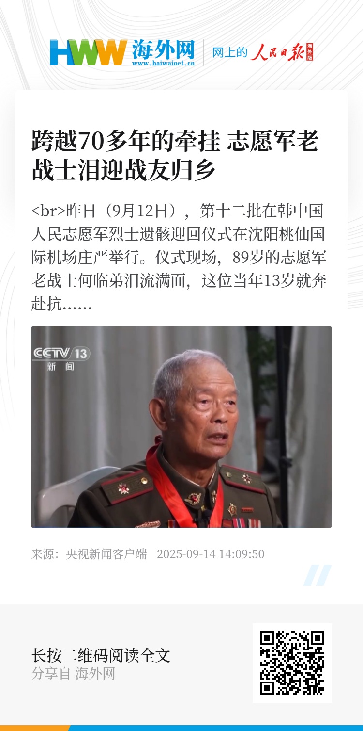昨日(9月12日),第十二批在韩中国人民志愿军烈士遗骸迎回仪式在沈阳桃仙国际机场庄严举行。仪式现场,89岁的志愿军老战士何临弟泪流满面,这位当年13岁就奔赴抗美援朝战场的老人,看着昔日战友英灵归国,埋藏了七十多年的情感再次奔涌。
