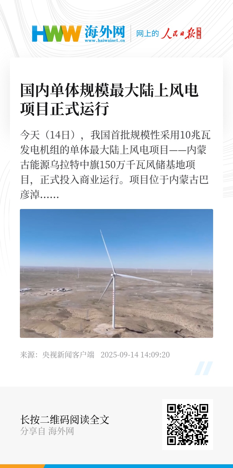 今天(14日),我国首批规模性采用10兆瓦发电机组的单体最大陆上风电项目——内蒙古能源乌拉特中旗150万千瓦风储基地项目,正式投入商业运行。