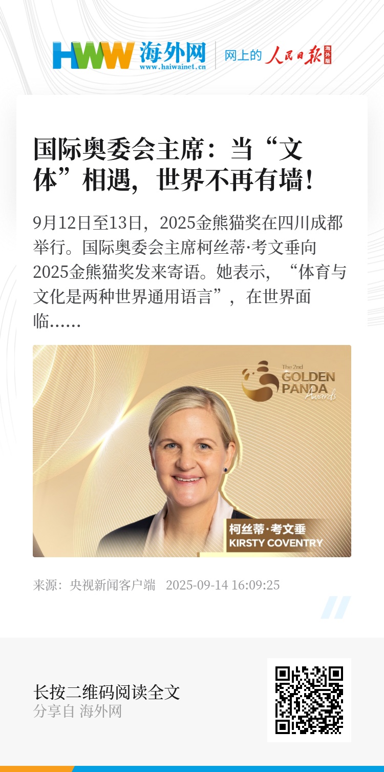 9月12日至13日,2025金熊猫奖在四川成都举行。国际奥委会主席柯丝蒂·考文垂向2025金熊猫奖发来寄语。她表示,“体育与文化是两种世界通用语言”,在世界面临分歧与冲突的当下,文化艺术能够跨越一切疆界,凝聚人心、激励大众、促进和平,展现出非凡的力量。
