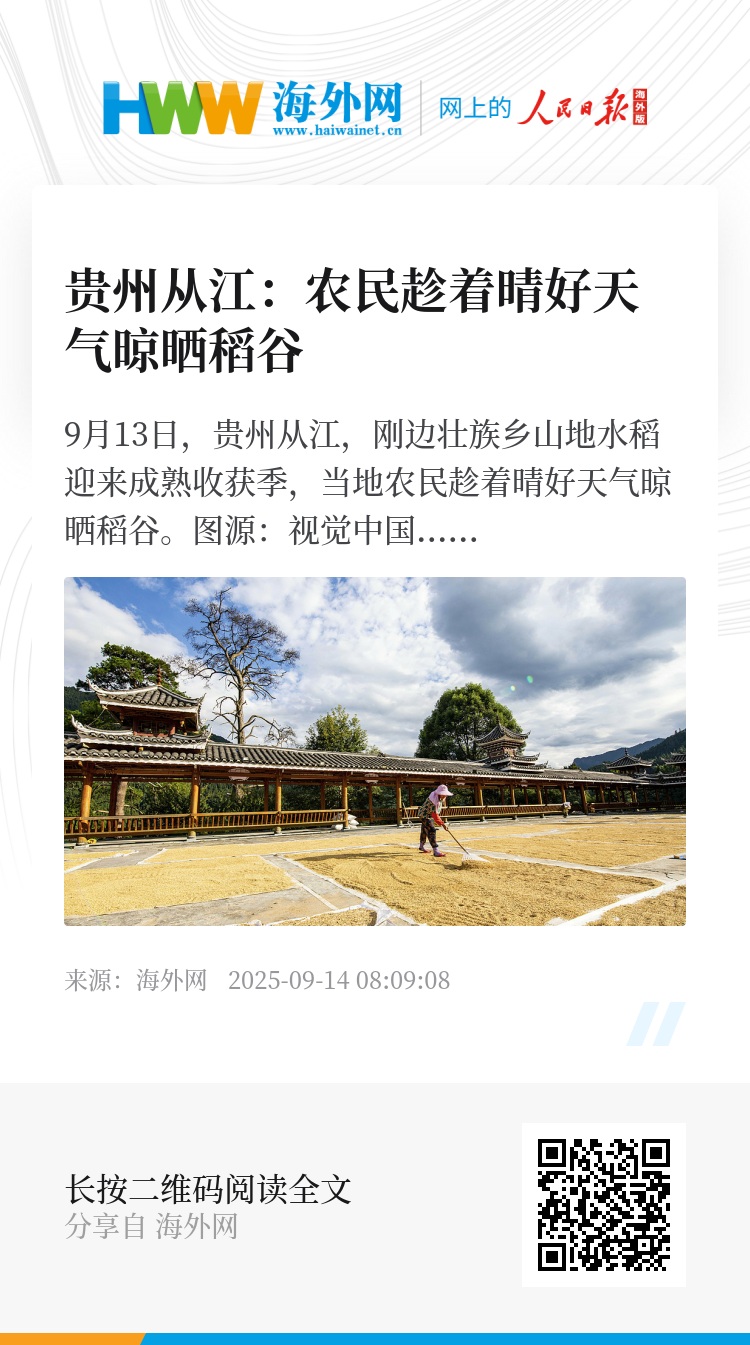 32894116,.贵州从江:农民趁着晴好天气晾晒稻谷,.2025-09-14 08:18:08,.204309,.陈亚楠、姚凯红