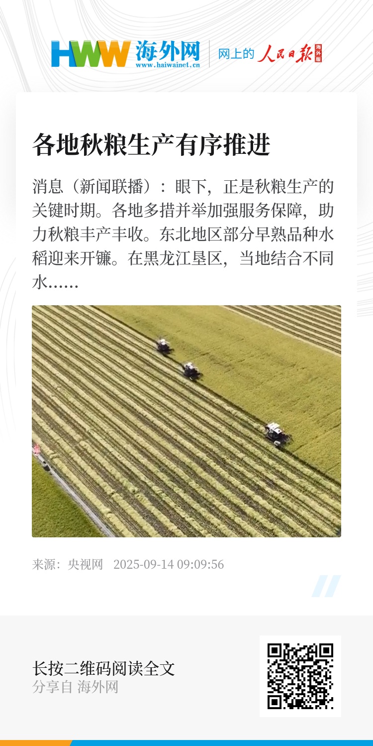 央视网消息(新闻联播):眼下,正是秋粮生产的关键时期。各地多措并举加强服务保障,助力秋粮丰产丰收。