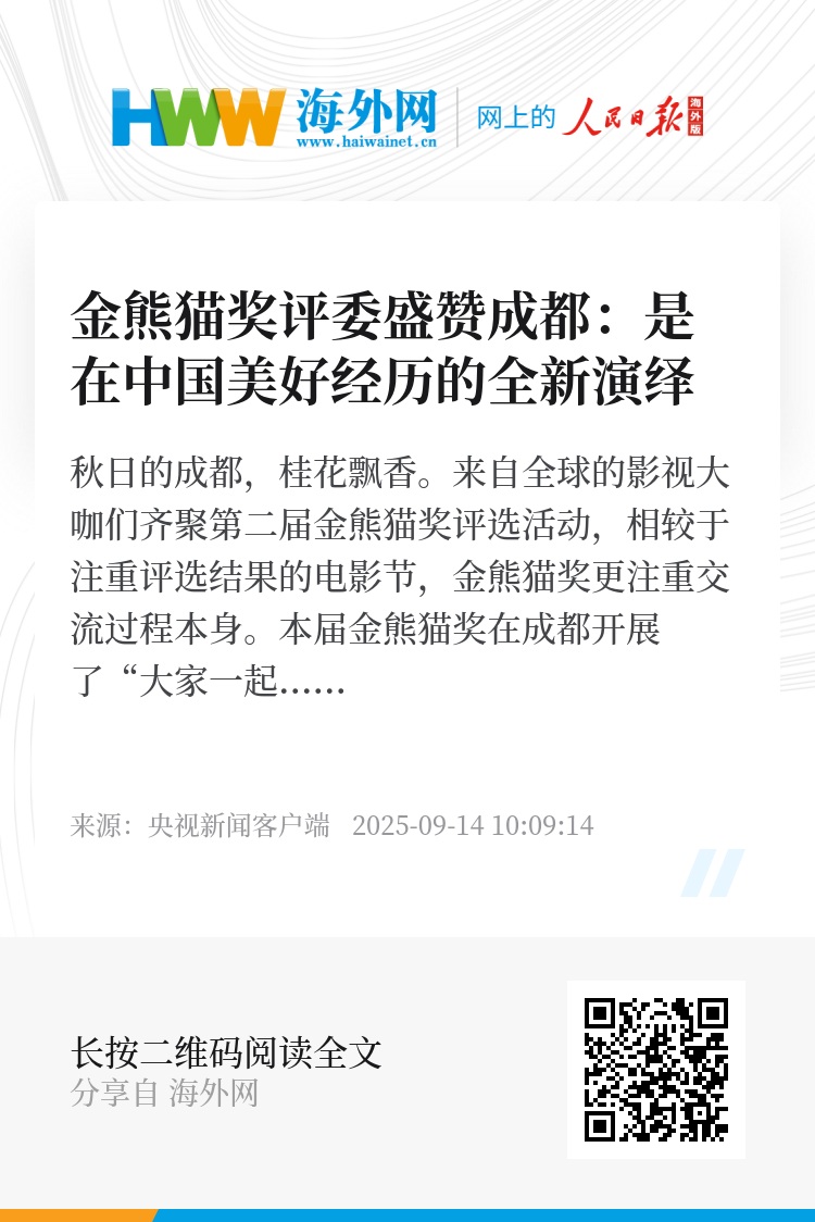 秋日的成都,桂花飘香。来自全球的影视大咖们齐聚第二届金熊猫奖评选活动,相较于注重评选结果的电影节,金熊猫奖更注重交流过程本身。本届金熊猫奖在成都开展了“大家一起看电影”“熊猫带你看世界”“我与熊猫面对面”三项配套活动。评委们在专注评审工作之余,他们也会漫步成都街头,感受这座千年古都的现代脉动。令人惊喜的是,评委们不仅对参赛作品给予高度评价,更对成都这座城市赞不绝口。
