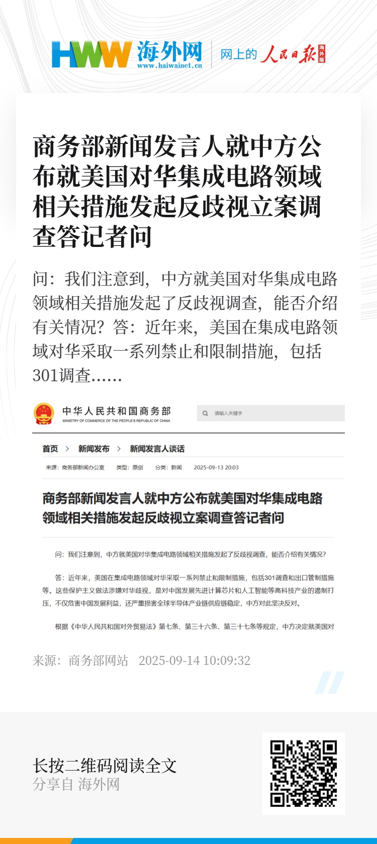 问:我们注意到,中方就美国对华集成电路领域相关措施发起了反歧视调查,能否介绍有关情况?