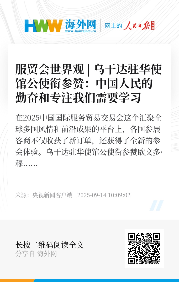 在2025中国国际服务贸易交易会这个汇聚全球多国风情和前沿成果的平台上,各国参展客商不仅收获了新订单,还获得了全新的参会体验。乌干达驻华使馆公使衔参赞欧文多·穆卡加·查尔斯在接受总台环球资讯广播采访时预计,服贸会后,前往乌干达的中国游客数量会大幅增加。他同时表示,中国人民的勤奋、专注和做事的决心,乌干达人民需要学习。