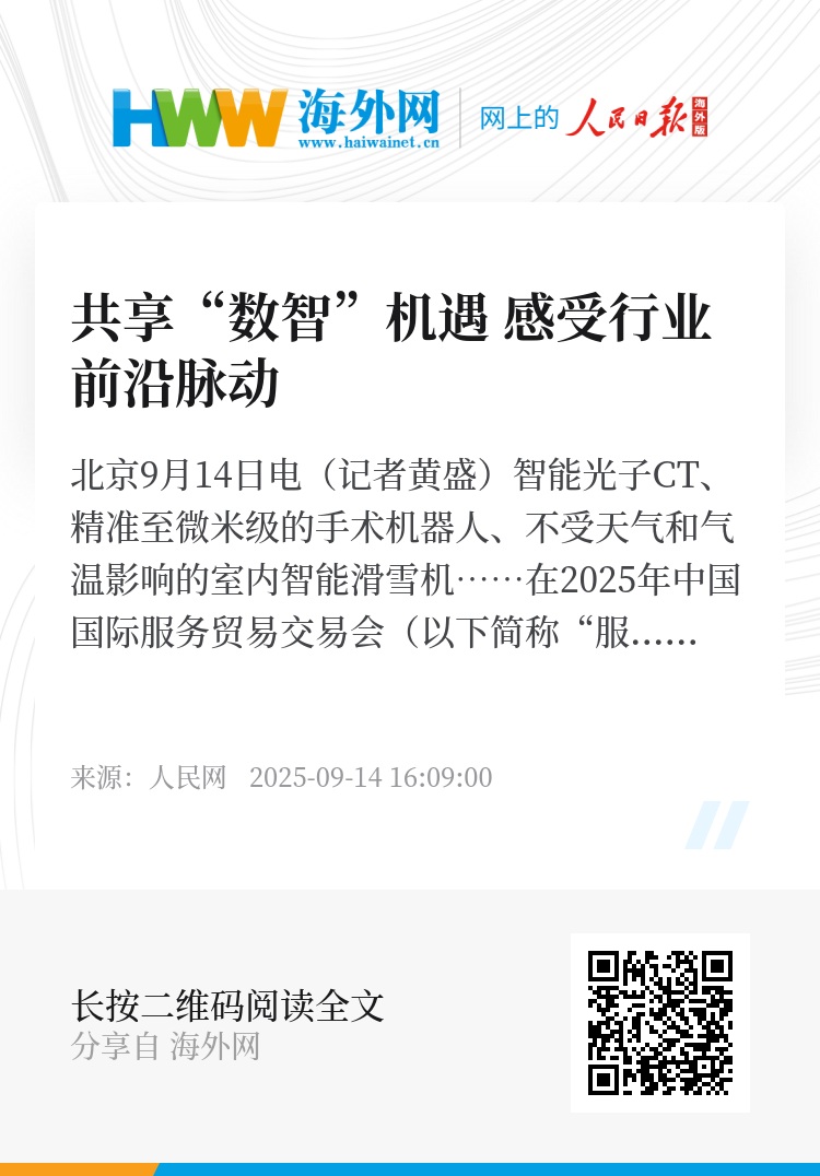 人民网北京9月14日电(记者黄盛)智能光子CT、精准至微米级的手术机器人、不受天气和气温影响的室内智能滑雪机……在2025年中国国际服务贸易交易会(以下简称“服贸会”)期间,各主题展区纷纷推出了人工智能(以下简称“AI”)新技术、数字应用场景、智能服务解决方案。数字化、智能化正推动全球服务贸易提质升级,让消费者和企业沉浸式感受行业前沿脉动。