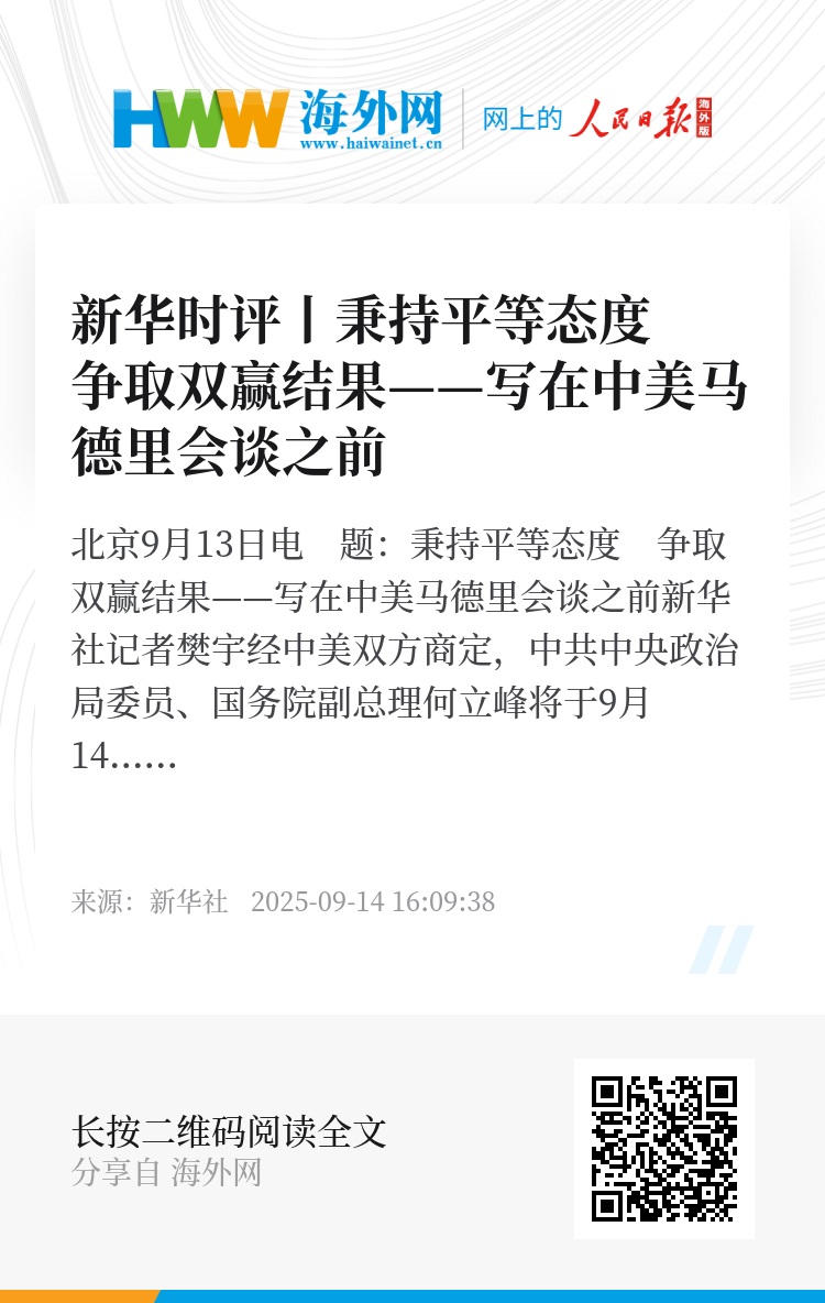 新华社北京9月13日电 题:秉持平等态度 争取双赢结果——写在中美马德里会谈之前