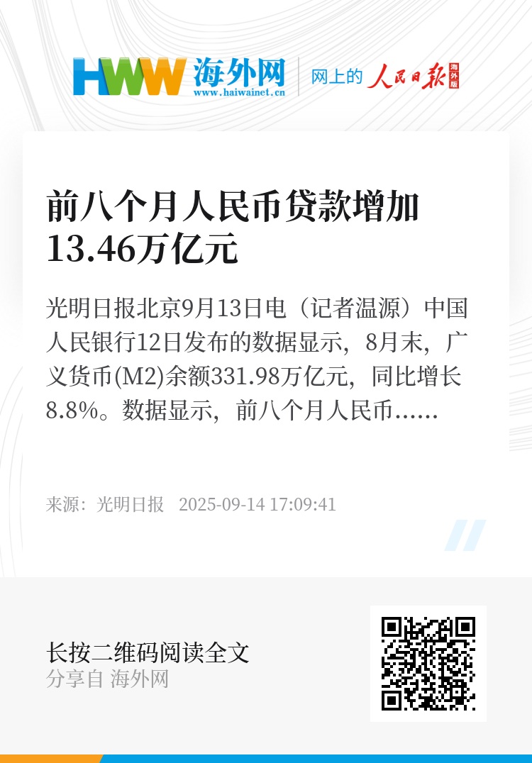 光明日报北京9月13日电(记者温源)中国人民银行12日发布的数据显示,8月末,广义货币(M2)余额331.98万亿元,同比增长8.8%。