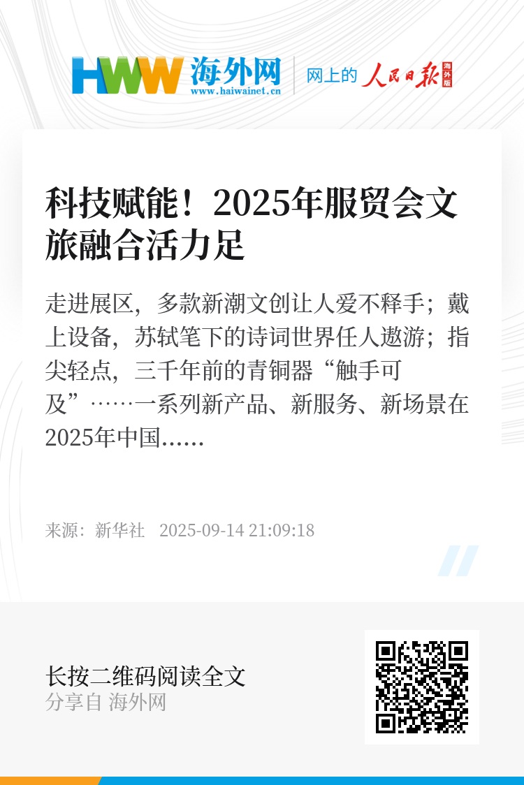 走进展区,多款新潮文创让人爱不释手;戴上设备,苏轼笔下的诗词世界任人遨游;指尖轻点,三千年前的青铜器“触手可及”……一系列新产品、新服务、新场景在2025年中国国际服务贸易交易会文旅服务专题亮相,漫步其中,处处感受到科技与创意奔涌、文化和旅游融合的无限活力。