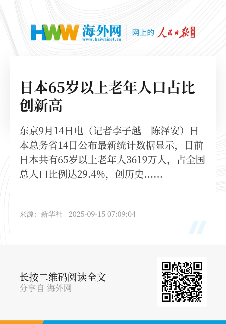 新华社东京9月14日电(记者李子越 陈泽安)日本总务省14日公布最新统计数据显示,目前日本共有65岁以上老年人3619万人,占全国总人口比例达29.4%,创历史新高。