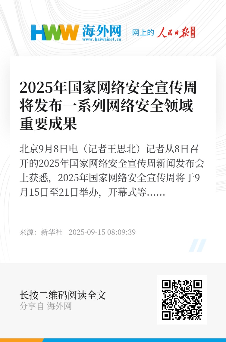 新华社北京9月8日电(记者王思北)记者从8日召开的2025年国家网络安全宣传周新闻发布会上获悉,2025年国家网络安全宣传周将于9月15日至21日举办,开幕式等重要活动将在云南省昆明市举行。网安周期间,将集中发布《人工智能安全治理框架》2.0版等一系列网络安全领域重要成果。