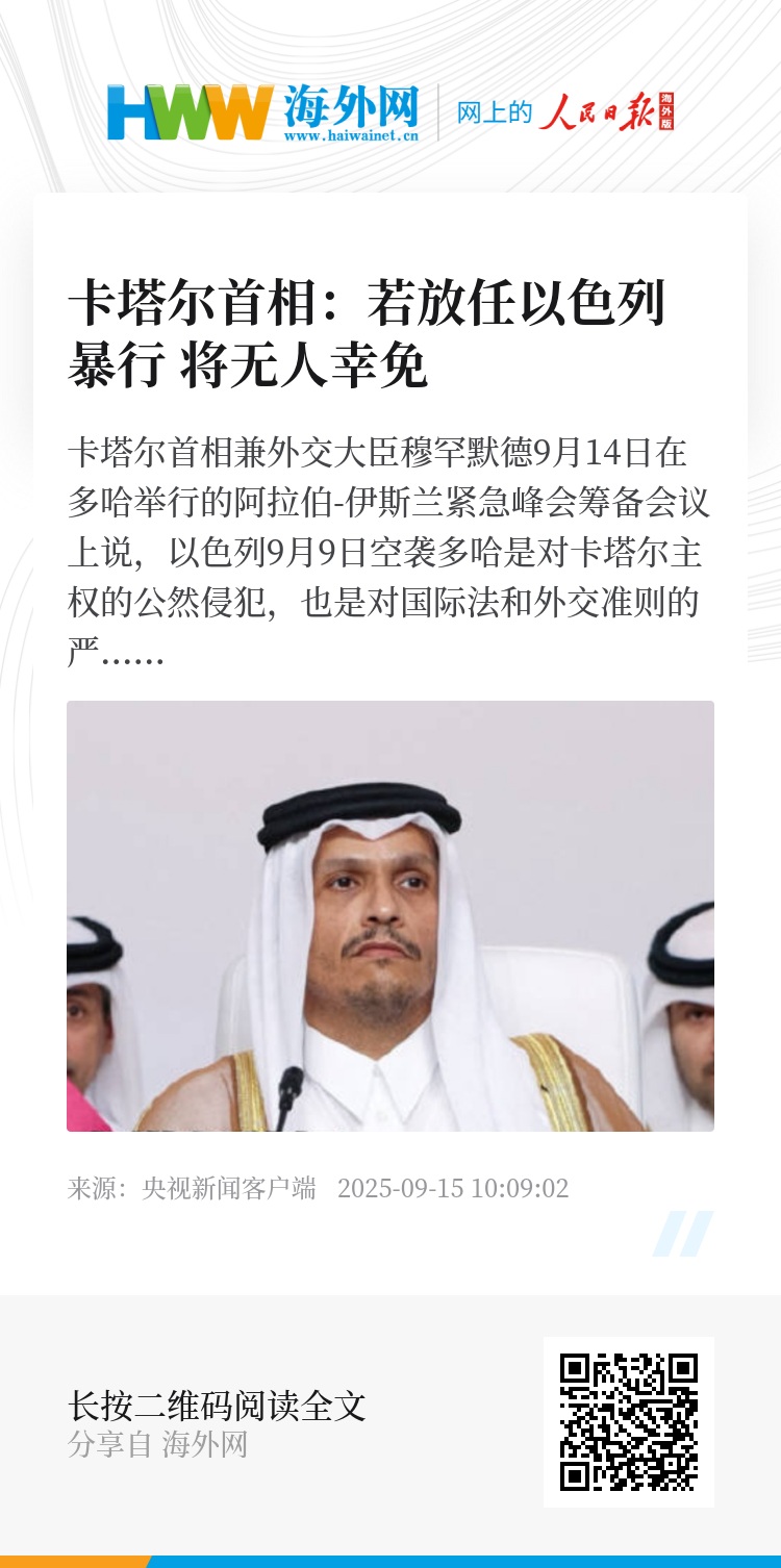 卡塔尔首相兼外交大臣穆罕默德9月14日在多哈举行的阿拉伯-伊斯兰紧急峰会筹备会议上说,以色列9月9日空袭多哈是对卡塔尔主权的公然侵犯,也是对国际法和外交准则的严重践踏,证明以色列政府拒绝通过和平方式解决巴勒斯坦问题。穆罕默德指出,绝不能对这些野蛮袭击保持沉默与消极,若放任不管,暴行将永无止境,终将无人幸免。