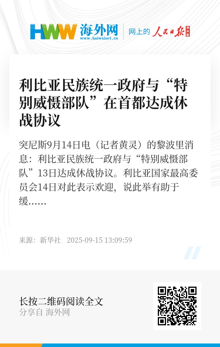 新华社突尼斯9月14日电(记者黄灵)的黎波里消息:利比亚民族统一政府与“特别威慑部队”13日达成休战协议。利比亚国家最高委员会14日对此表示欢迎,说此举有助于缓解首都的黎波里的紧张局势。