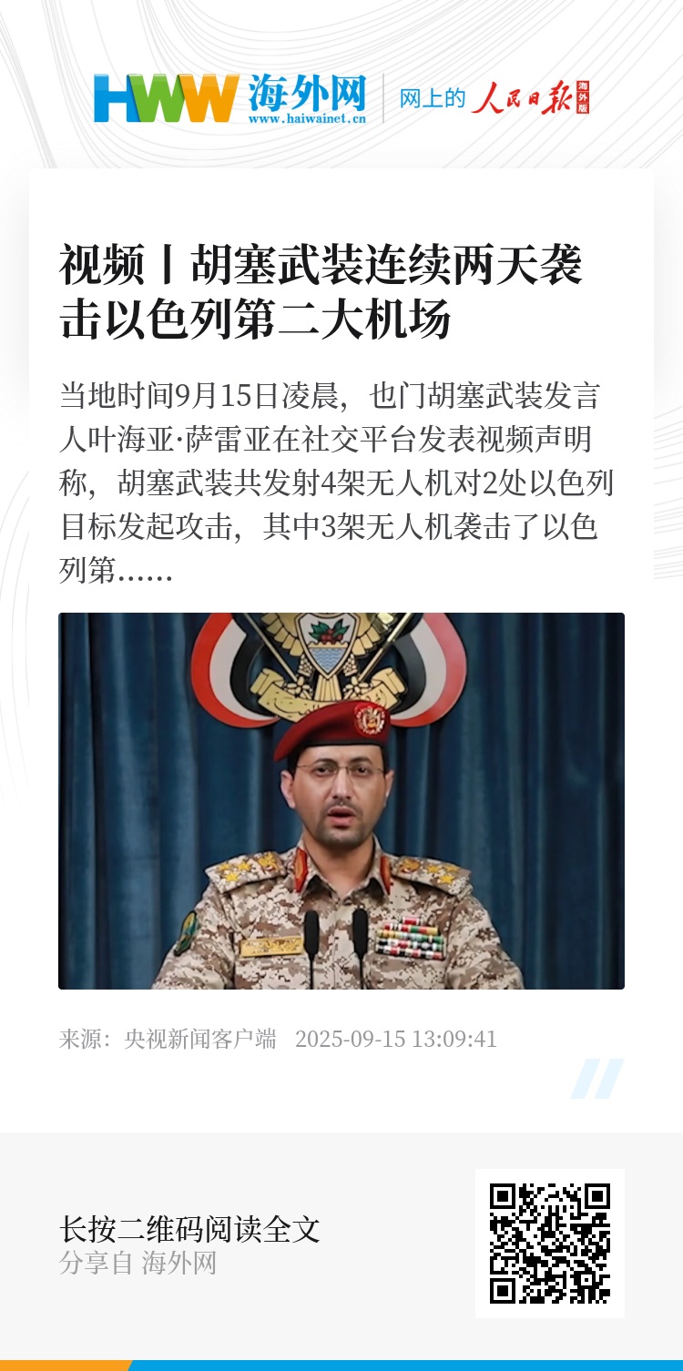 当地时间9月15日凌晨,也门胡塞武装发言人叶海亚·萨雷亚在社交平台发表视频声明称,胡塞武装共发射4架无人机对2处以色列目标发起攻击,其中3架无人机袭击了以色列第二大机场——拉蒙机场,还有1架无人机袭击了位于内盖夫地区的以色列军事目标。