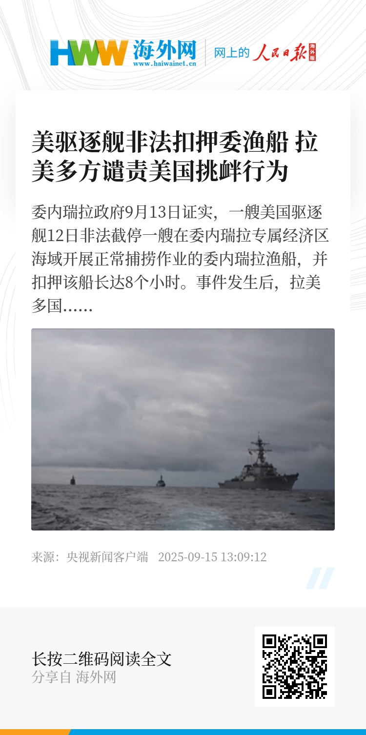 委内瑞拉政府9月13日证实,一艘美国驱逐舰12日非法截停一艘在委内瑞拉专属经济区海域开展正常捕捞作业的委内瑞拉渔船,并扣押该船长达8个小时。事件发生后,拉美多国领导人和组织纷纷谴责美方这一挑衅行为。
