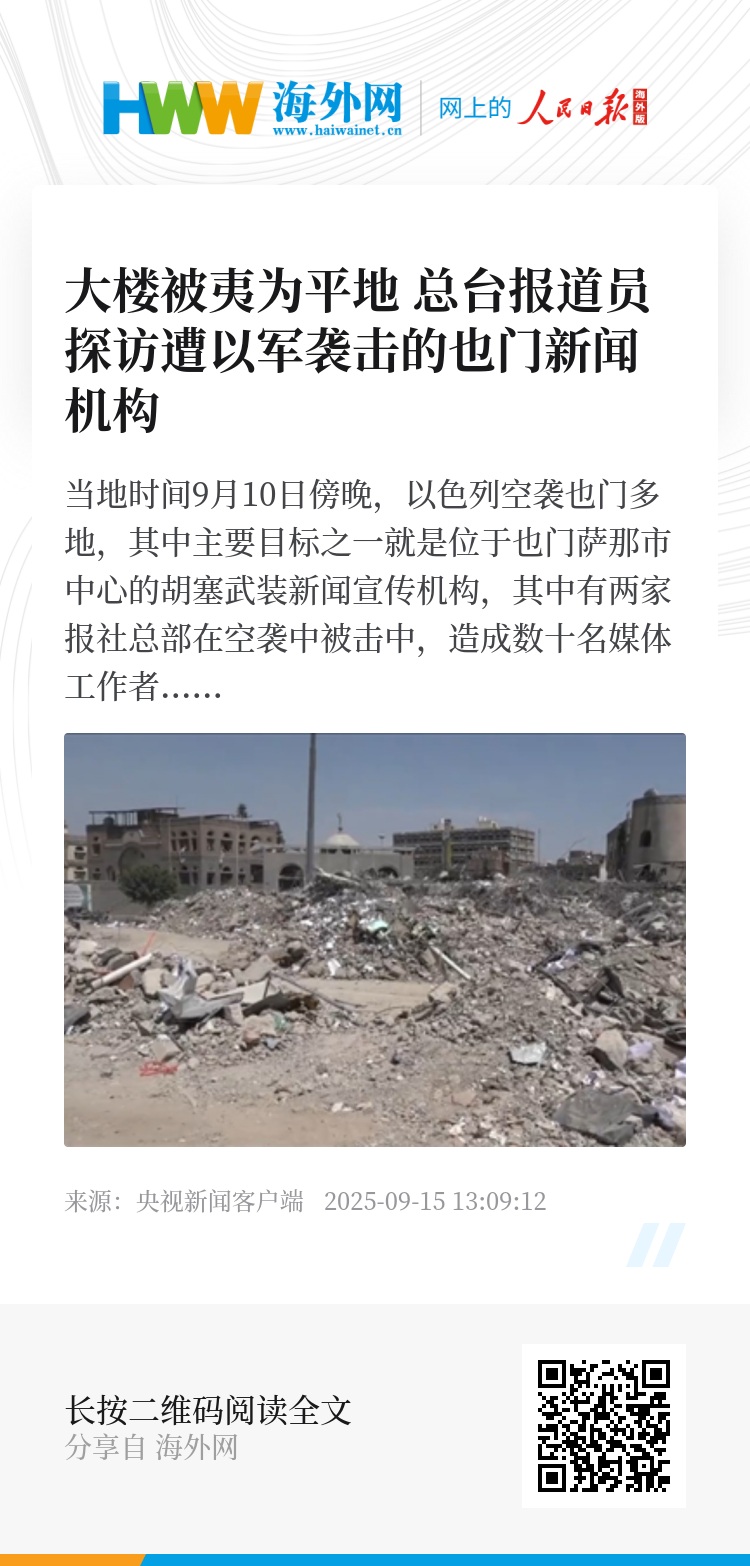当地时间9月10日傍晚,以色列空袭也门多地,其中主要目标之一就是位于也门萨那市中心的胡塞武装新闻宣传机构,其中有两家报社总部在空袭中被击中,造成数十名媒体工作者遇难。当地时间14日,总台报道团队获准进入遭袭地点进行探访。