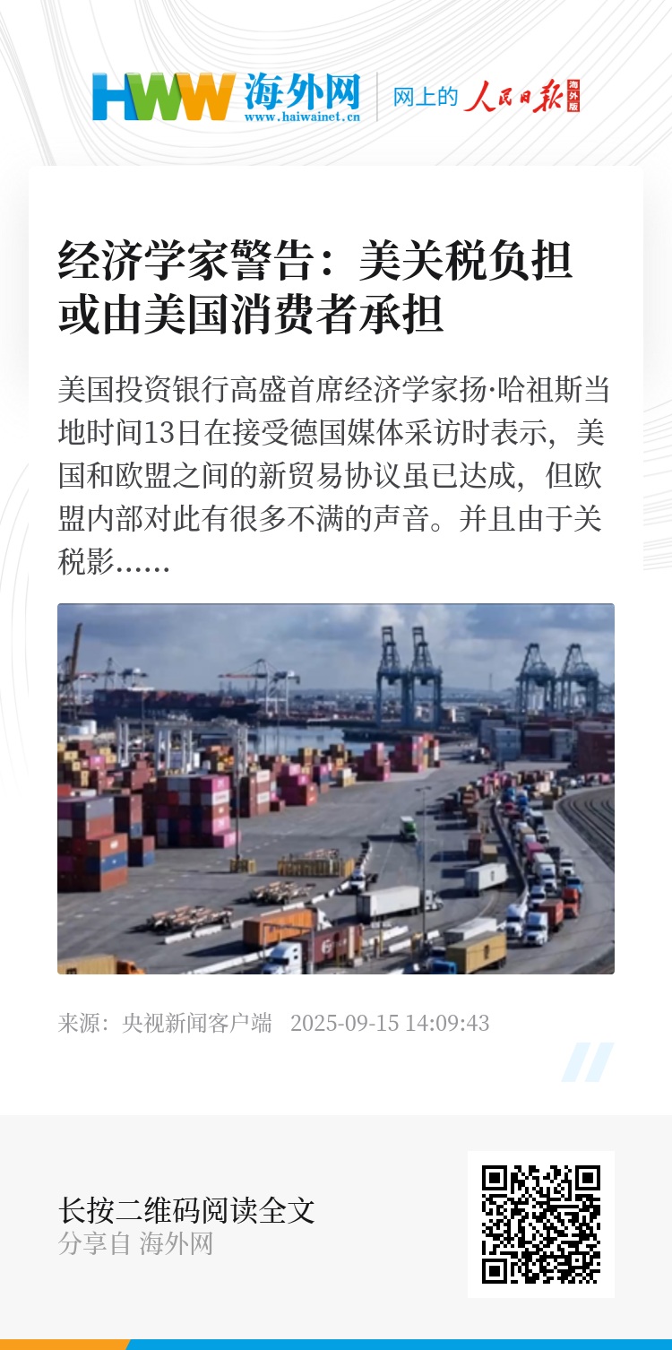 美国投资银行高盛首席经济学家扬·哈祖斯当地时间13日在接受德国媒体采访时表示,美国和欧盟之间的新贸易协议虽已达成,但欧盟内部对此有很多不满的声音。并且由于关税影响,协议将会导致欧盟输美商品价格上涨,而这部分关税负担最终可能将会由美国消费者承担。
