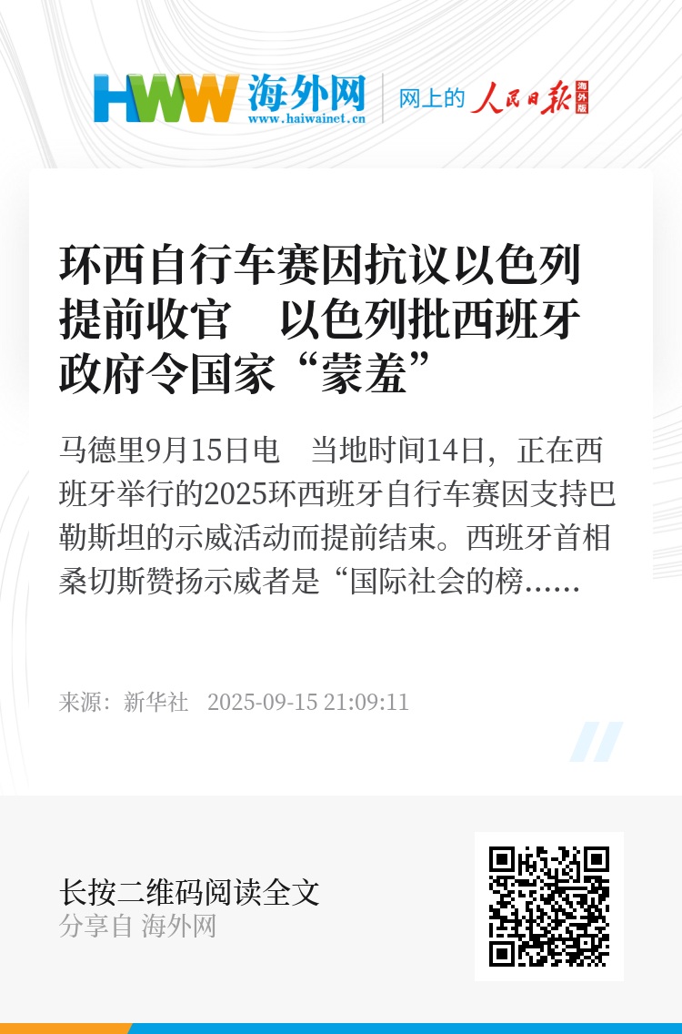 新华社马德里9月15日电 当地时间14日,正在西班牙举行的2025环西班牙自行车赛因支持巴勒斯坦的示威活动而提前结束。西班牙首相桑切斯赞扬示威者是“国际社会的榜样”,以色列则称桑切斯及西政府令国家“蒙羞”,两国外交摩擦加剧。