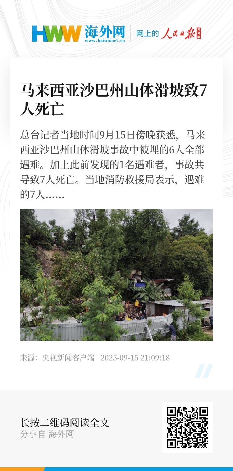 总台记者当地时间9月15日傍晚获悉,马来西亚沙巴州山体滑坡事故中被埋的6人全部遇难。加上此前发现的1名遇难者,事故共导致7人死亡。