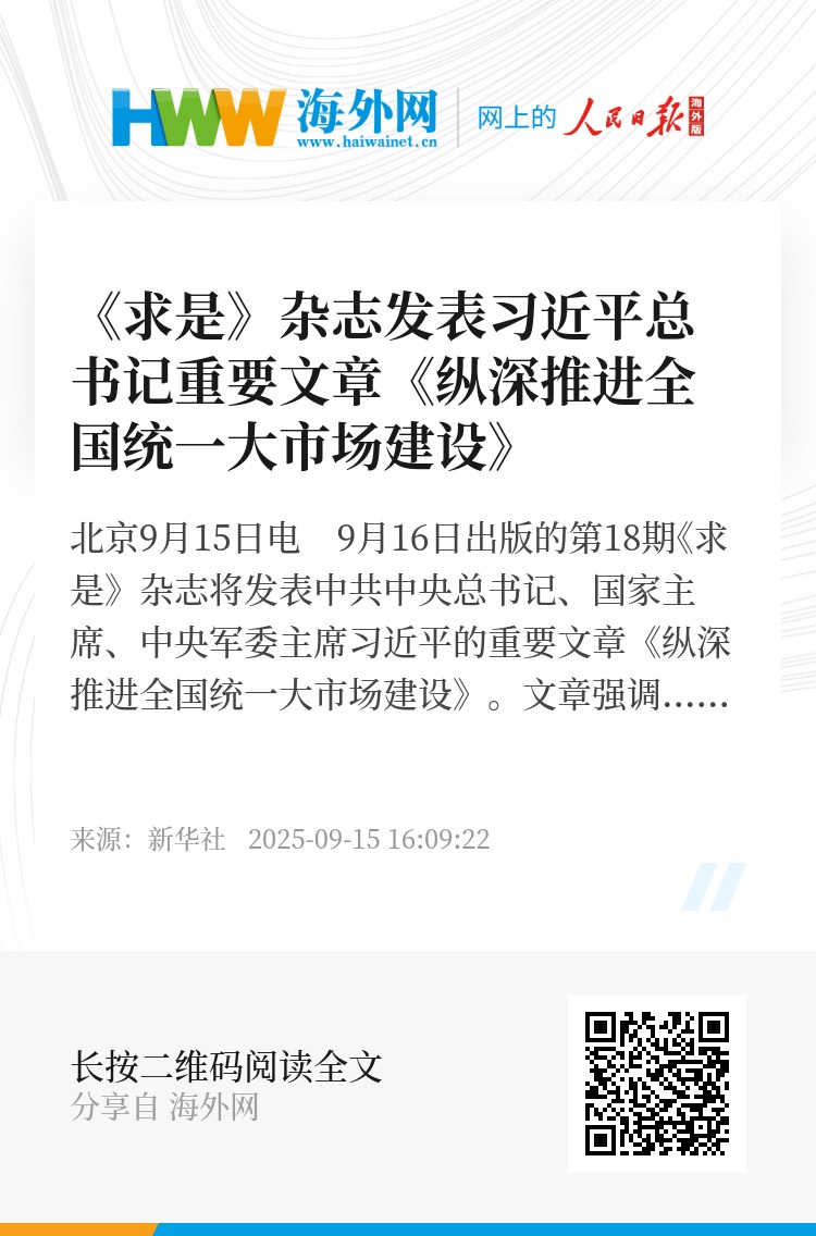 新华社北京9月15日电 9月16日出版的第18期《求是》杂志将发表中共中央总书记、国家主席、中央军委主席习近平的重要文章《纵深推进全国统一大市场建设》。