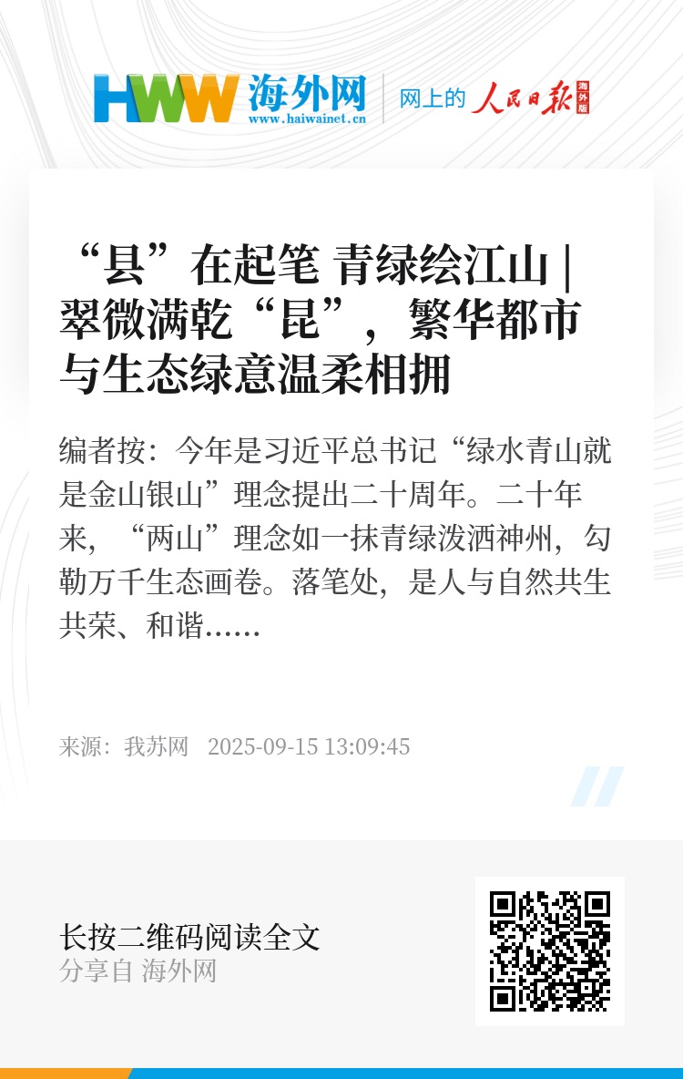 编者按:今年是习近平总书记“绿水青山就是金山银山”理念提出二十周年。二十年来,“两山”理念如一抹青绿泼洒神州,勾勒万千生态画卷。落笔处,是人与自然共生共荣、和谐发展的多彩中国。在江苏省互联网信息办公室的指导下,江苏省广播电视总台推出《“县”在起笔!青绿绘江山》融媒体行动,深度解码“两山”实践生动样本,探寻县域“中国色”如何绘就,邀你共读绿色发展的时代答卷。