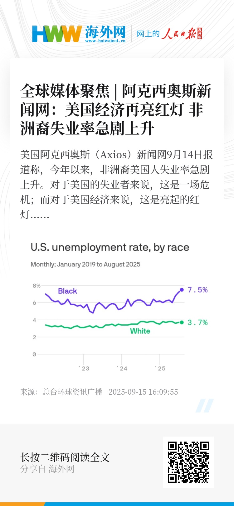 美国阿克西奥斯(Axios)新闻网9月14日报道称,今年以来,非洲裔美国人失业率急剧上升。对于美国的失业者来说,这是一场危机;而对于美国经济来说,这是亮起的红灯。
