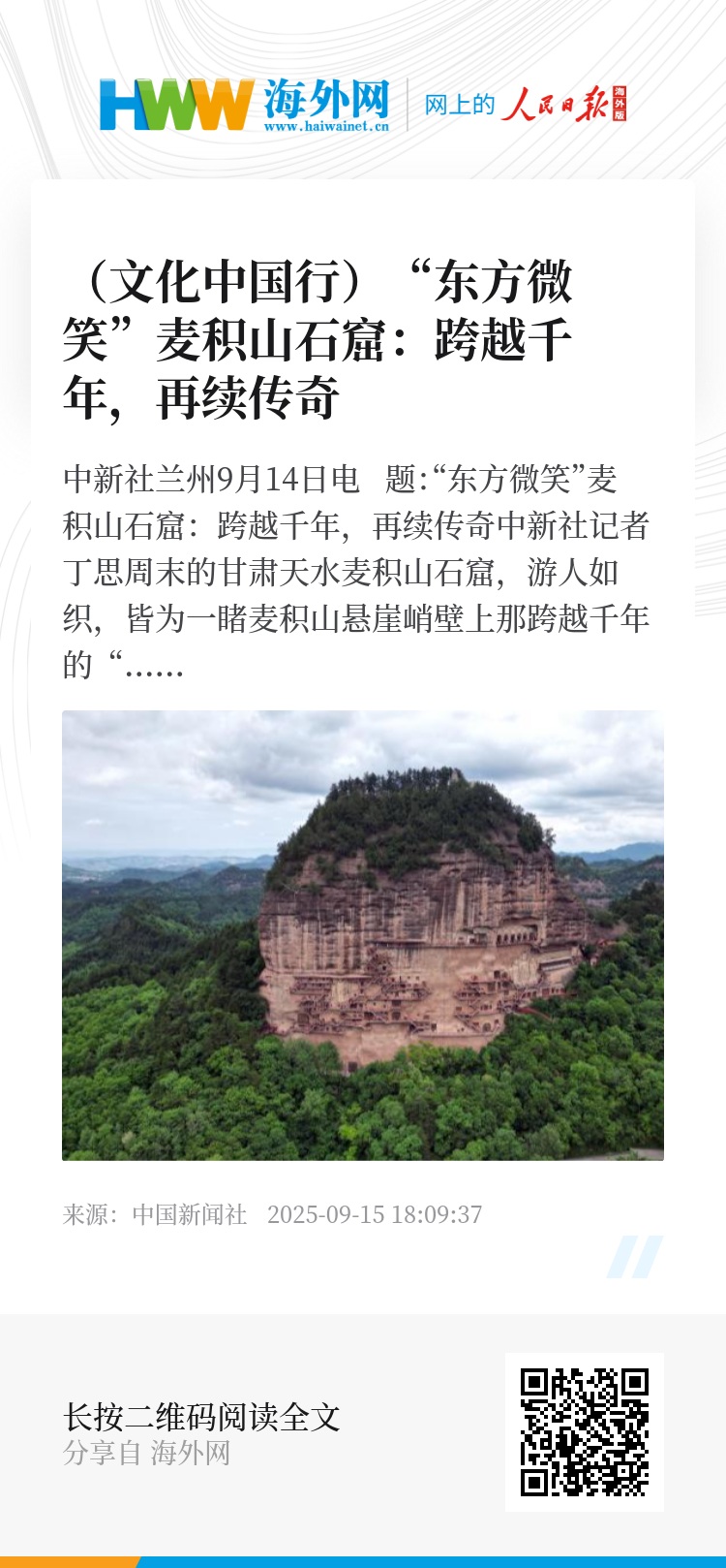 中新社兰州9月14日电 题:“东方微笑”麦积山石窟:跨越千年,再续传奇