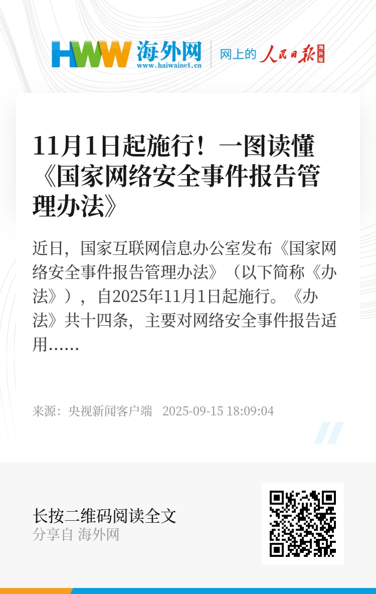 近日,国家互联网信息办公室发布《国家网络安全事件报告管理办法》(以下简称《办法》),自2025年11月1日起施行。