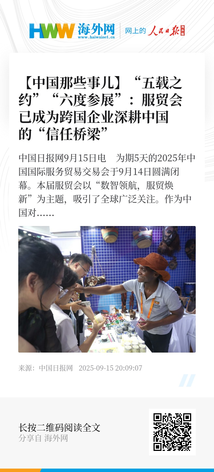 报道认为,2025年服贸会以其创纪录的参与度和丰富活动,彰显中国致力于打造包容、创新、协作的全球服务贸易平台的努力。一个开放的中国市场,正成为可持续增长、技术进步和多边合作的重要桥梁。