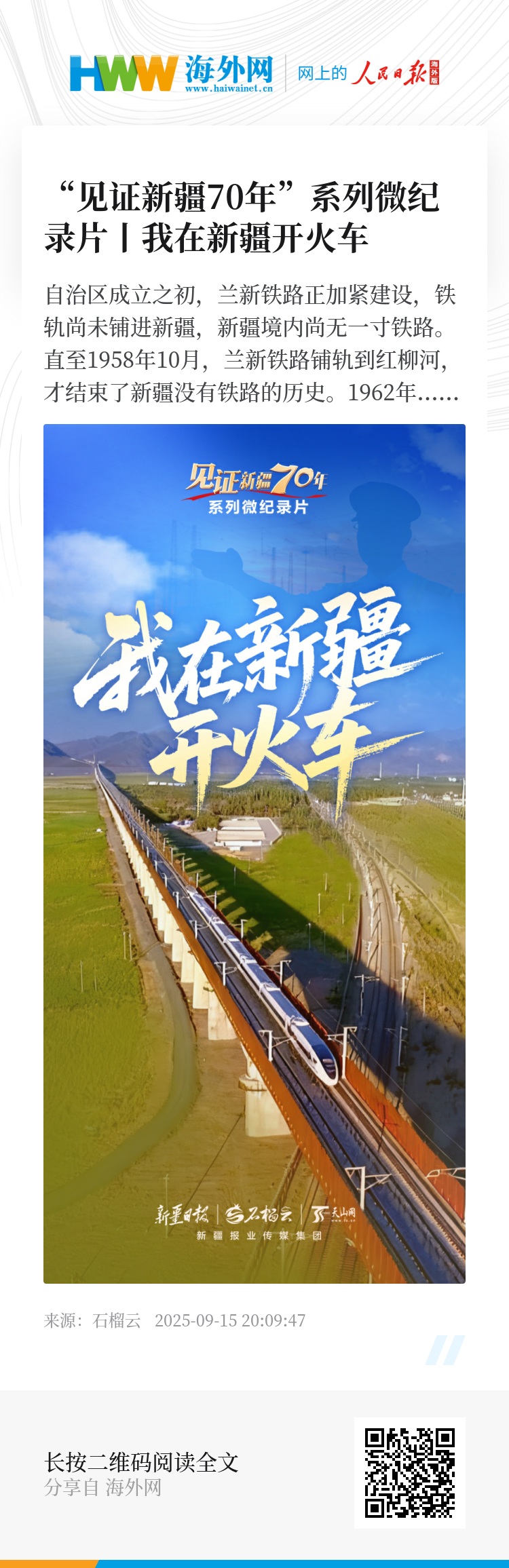 本期微纪录片,就带您走近三位火车司机,听他们讲述在新疆开火车的故事。他们分别是——宇文贵生,从蒸汽机车的煤烟缭绕到内燃机车的轰鸣,他亲历了铁路运输从艰辛起步到进入内燃机时代;蔡骏,他见证了内燃机车向电力机车、动车的转型,感受到从机控到智控的变革;王慧峰,如今的他正驾驶着 “复兴号” 驰骋,体验着智能化时代的 “中国速度”。