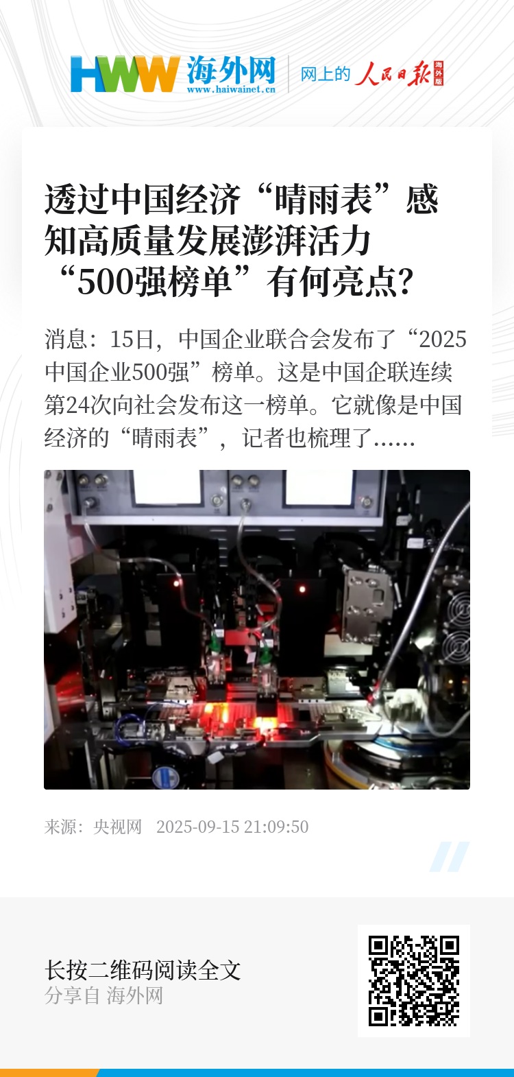 央视网消息:15日,中国企业联合会发布了“2025中国企业500强”榜单。这是中国企联连续第24次向社会发布这一榜单。它就像是中国经济的“晴雨表”,记者也梳理了榜单中的亮点,一起来了解。